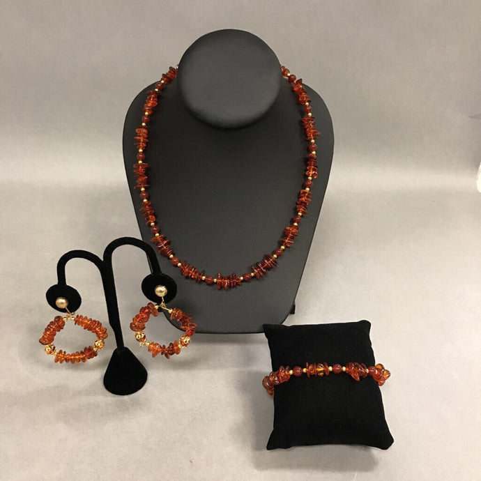 Goldtone Amber Chip Bead Necklace, Bracelet, Clip Earrings Set