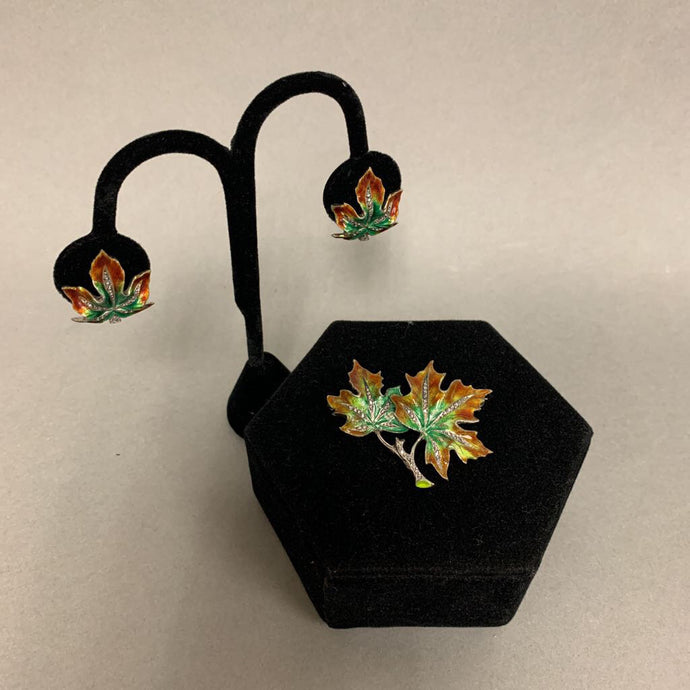 Alice Caviness Sterling Marcasite Enamel Leaf Pin & Clip Earrings Set