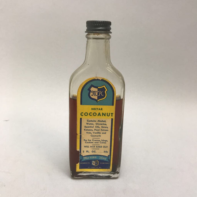 Antique MK Cocoanut Nectar 2oz Glass Bottle w Contents (5.5")