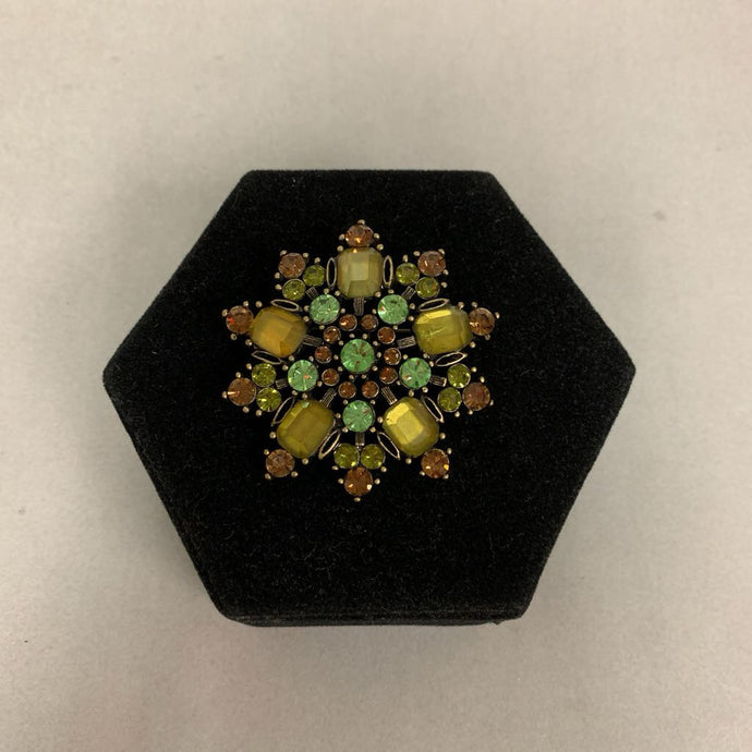 Antiqued Bronze Green & Tan Rhinestone Flower Brooch Pin (2")