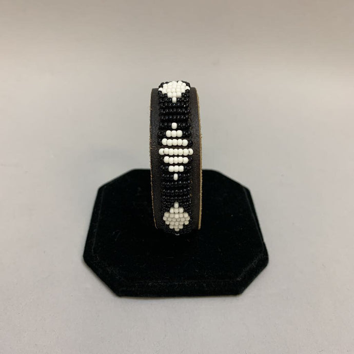 Black & White Seed Bead Pattern on Leather Snap Cuff Bracelet