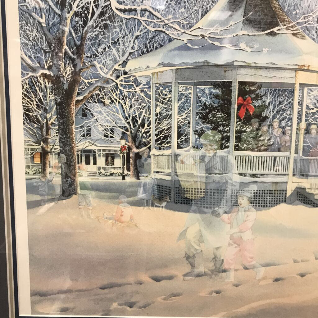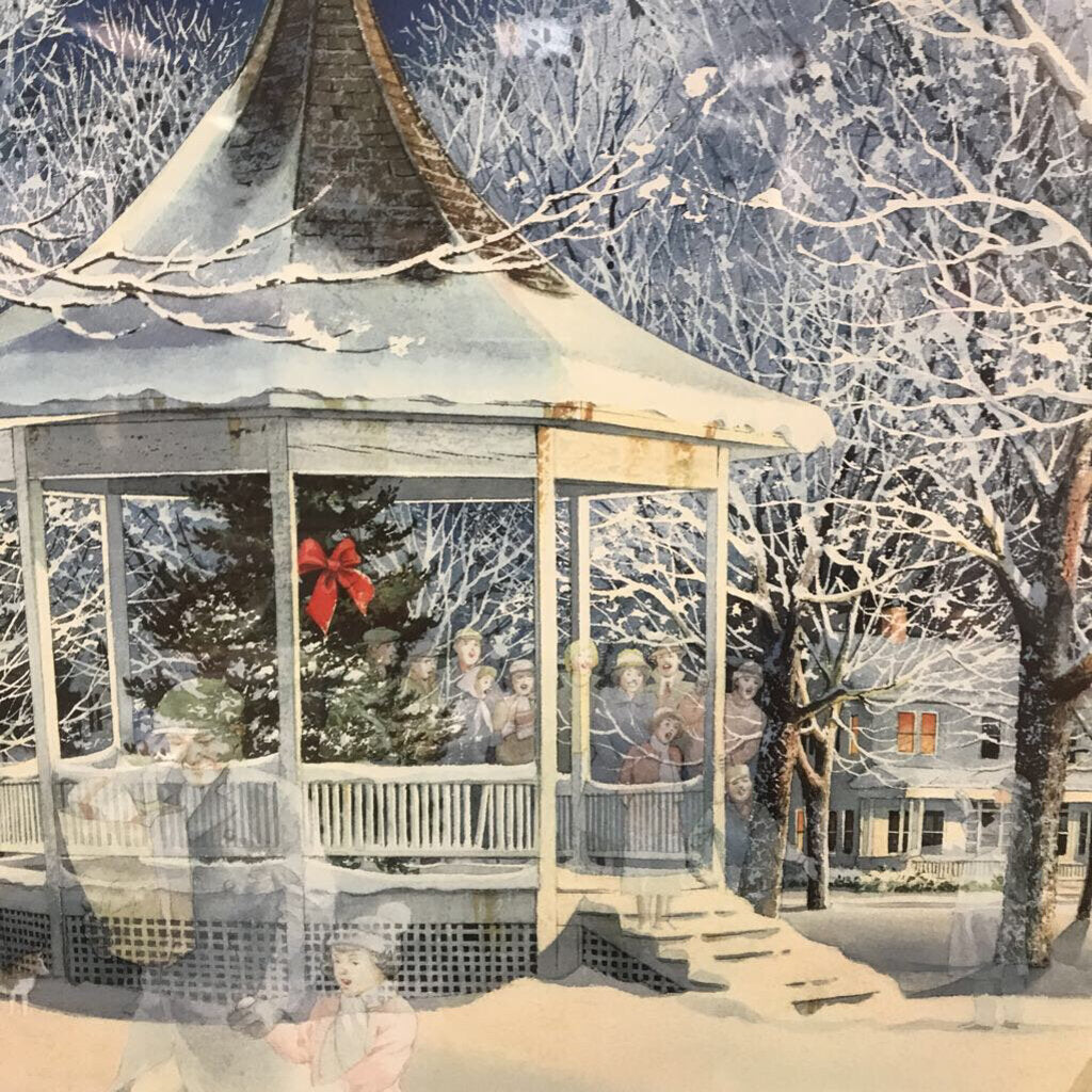 Charles Peterson Signed & Framed Print, "The Carolers", Christmas Winter Gazebo & Figures From the Past (~34x41)