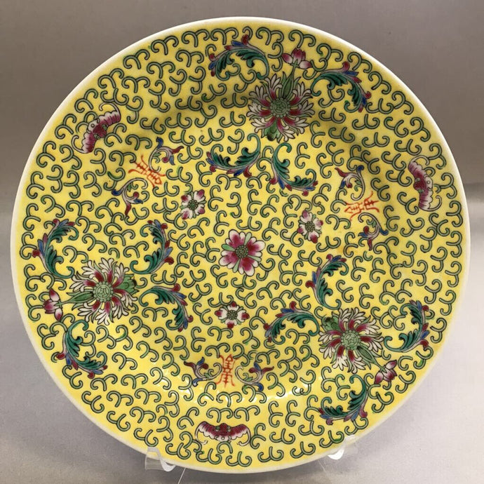 Vintage Chinese Famille Jaune Yellow Porcelain Plate Shou Bat Flowers Decoration (10")