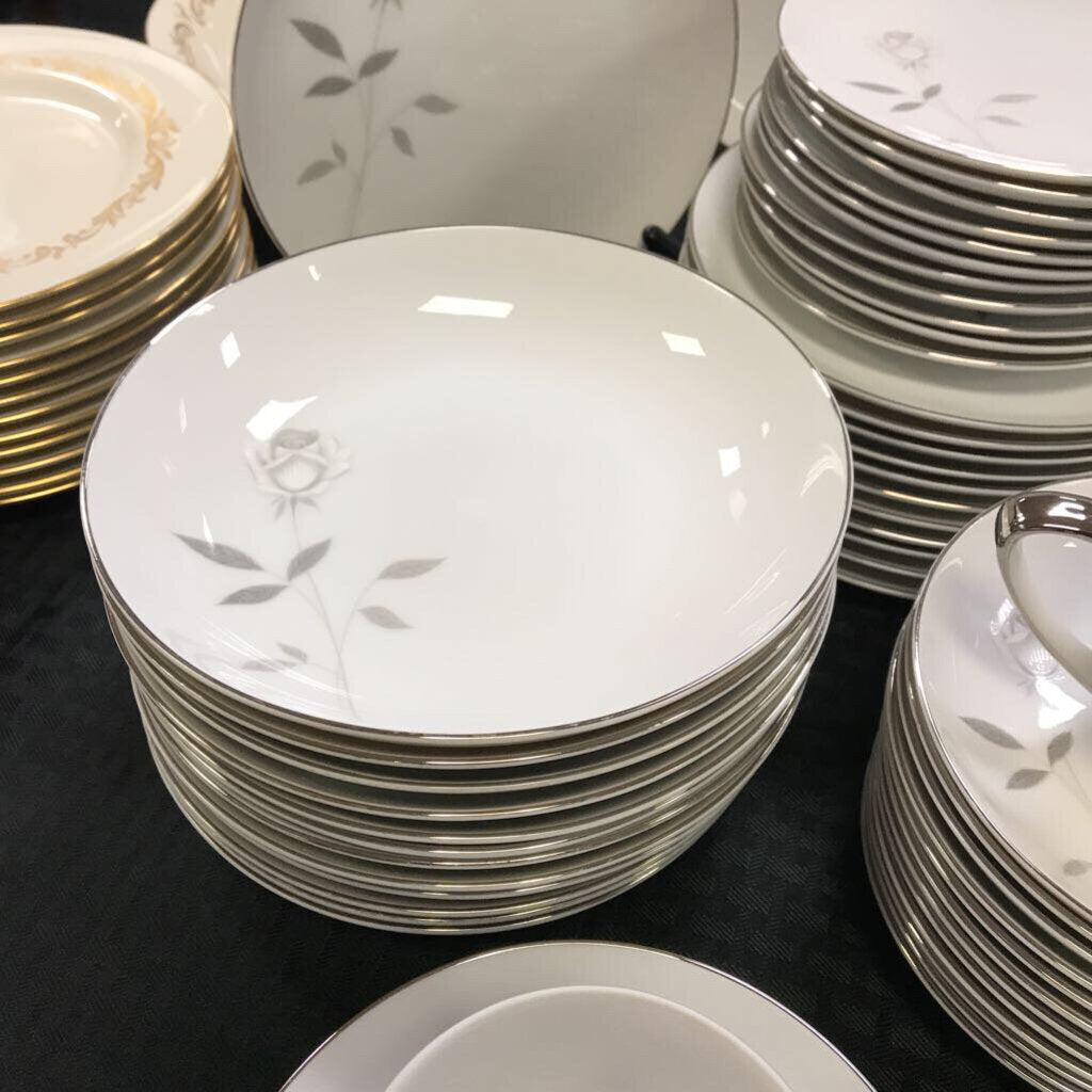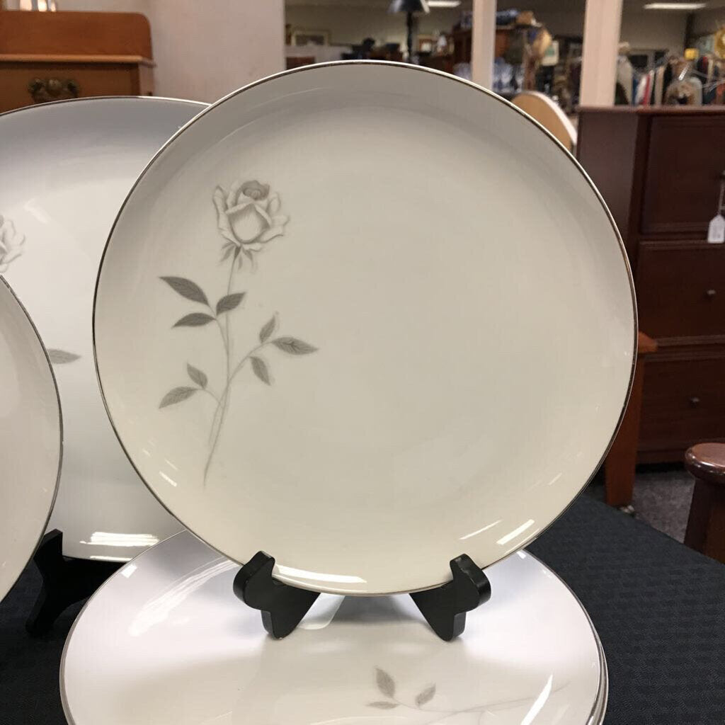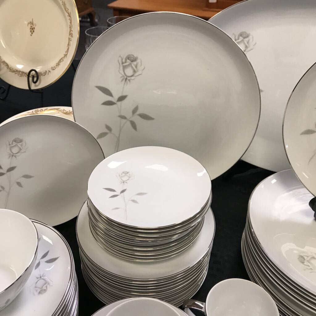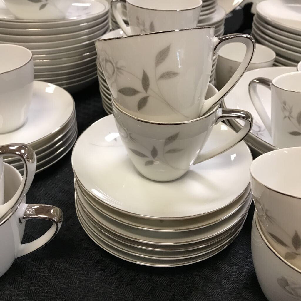 11 dinner plates; 12 salad plates; 11 bread & butter plates; 12 fruit/dessert (sauce) bowls; 12 coupe soup bowls; 11 cups with saucers; 1 cream & sugar set; 1 large oval platter; 1 large chop plate; 1 gravy boat with attached underplate; 2 serving bowls.