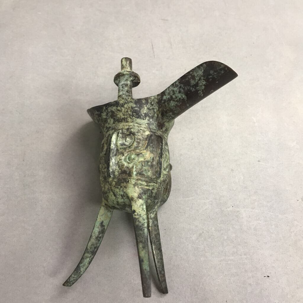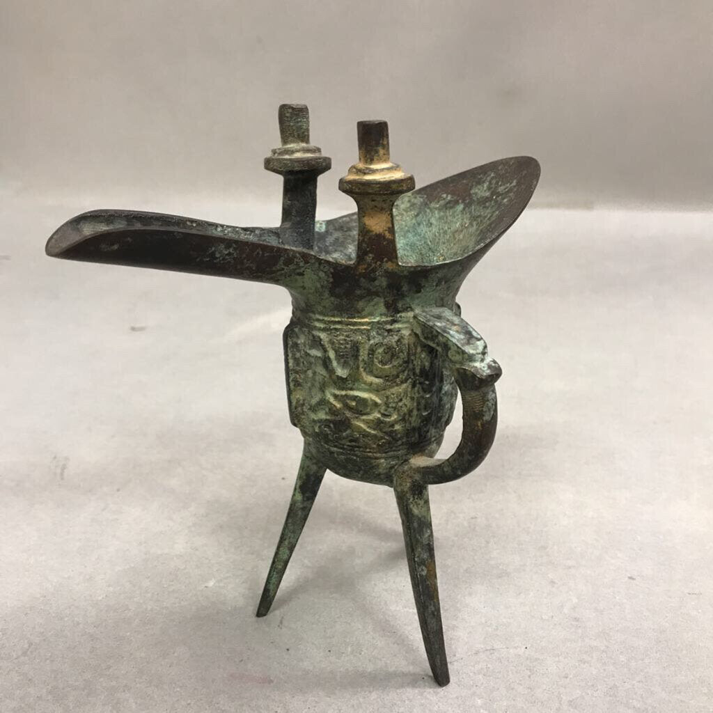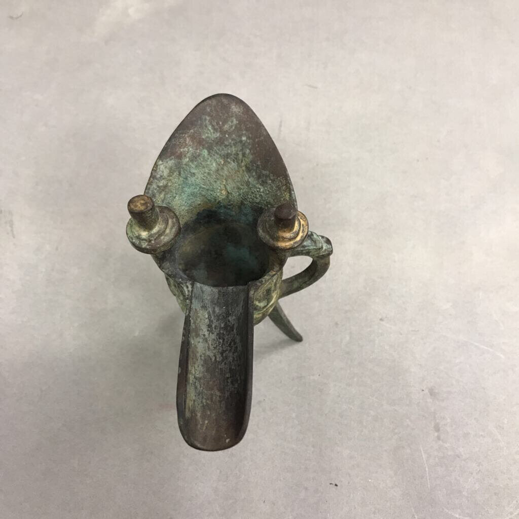 Chinese Bronze Ritual Jue Wine Vessel Cup Tri Pod Handle (5")