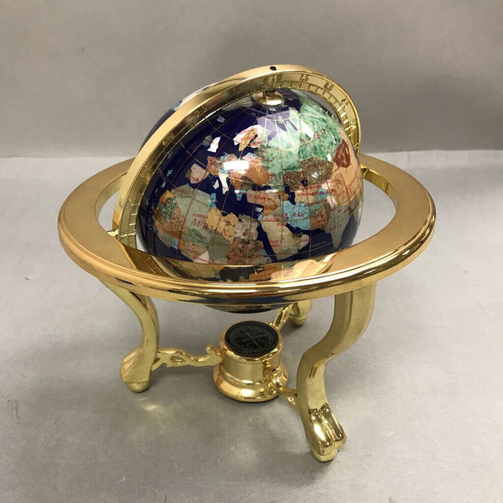 Gemstone Tabletop World Globe Semiprecious Inlay Lapis Compass (9")