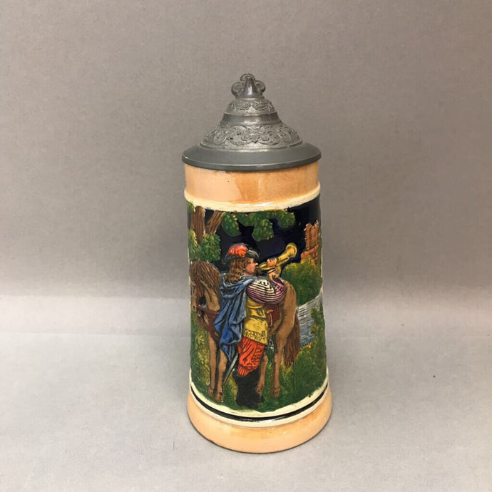 Vintage German Stein, Trumpeter & Horse, Forested Scene (~7")