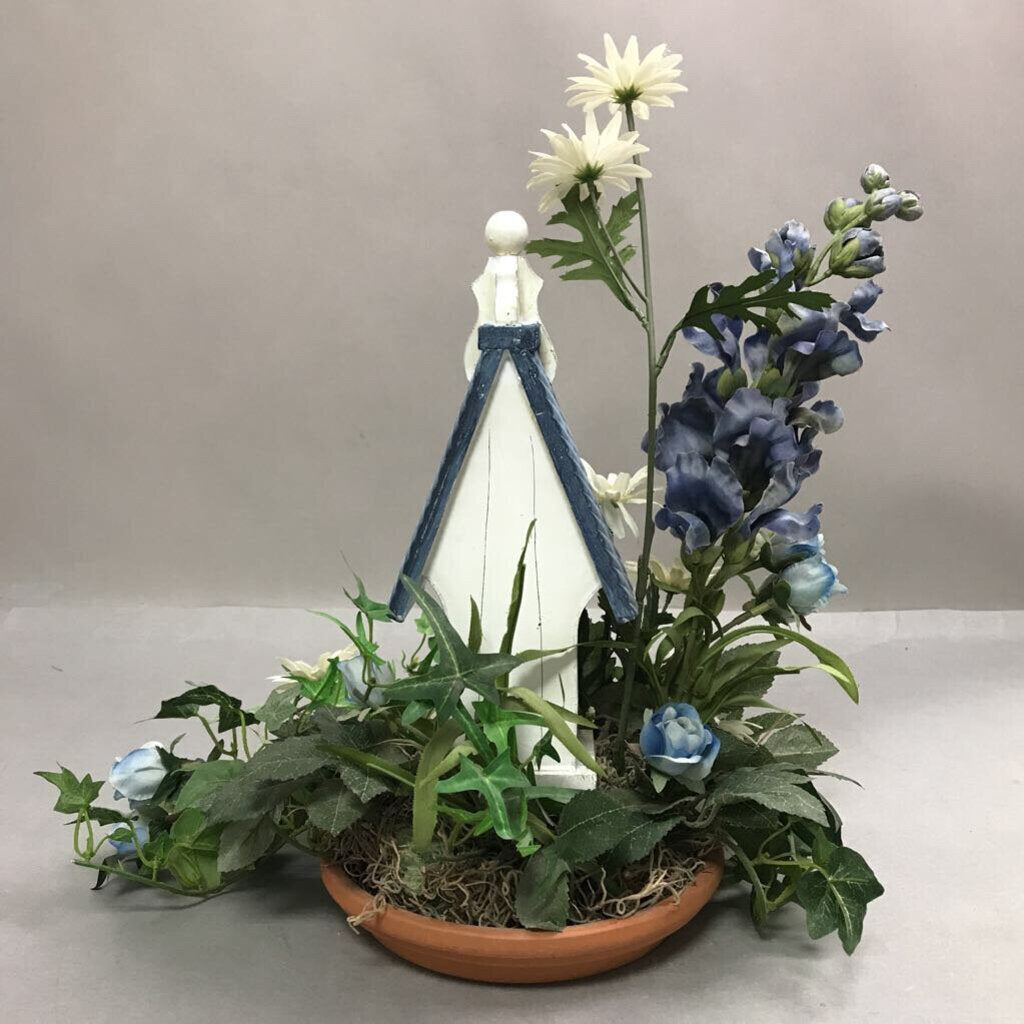 Distressed Wood Birdhouse with Blue Floral (15x12)