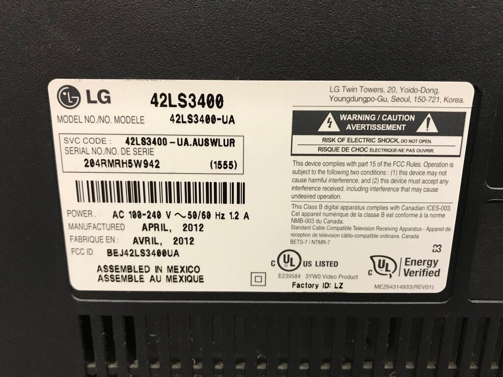 LG HDTV Television #42LS3400 (42" Screen) (No Remote)