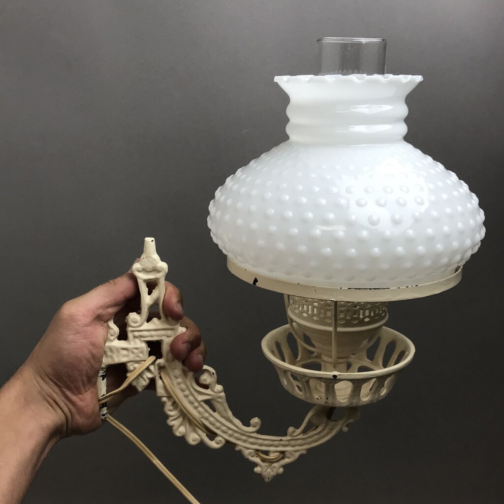 Cast Iron Swing-Arm Sconce w/ White Hobnail Shade (~8x7x12)
