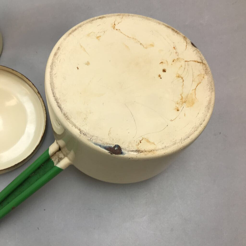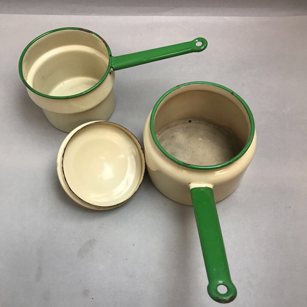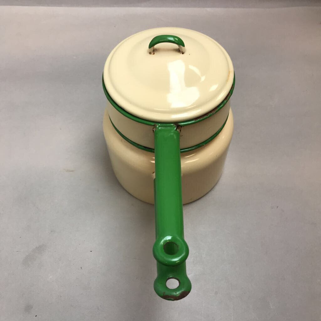 Vintage Green Trim & Pale Yellow Enamelware Saucepan Double Boiler with Lid (7")