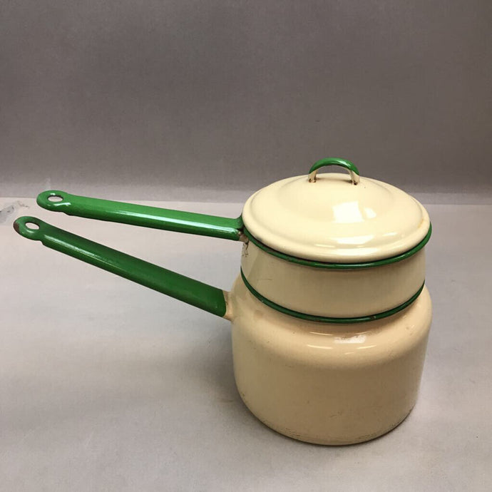 Vintage Green Trim & Pale Yellow Enamelware Saucepan Double Boiler with Lid (7")