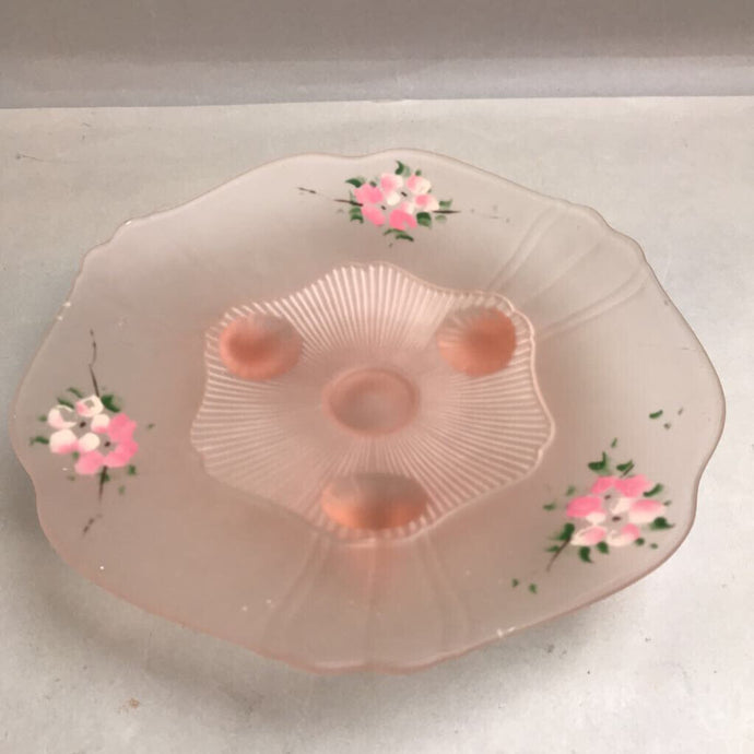 Vintage Glass 3 Footed Floral Painted Pink Frosted Bowl
