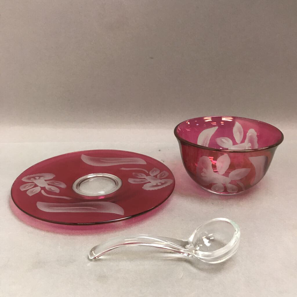Cranberry Glass Floral Serving Bowl and Plate with Glass Ladle (7inx4in) (Set of 3)