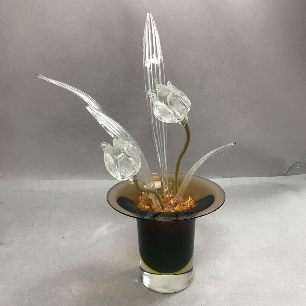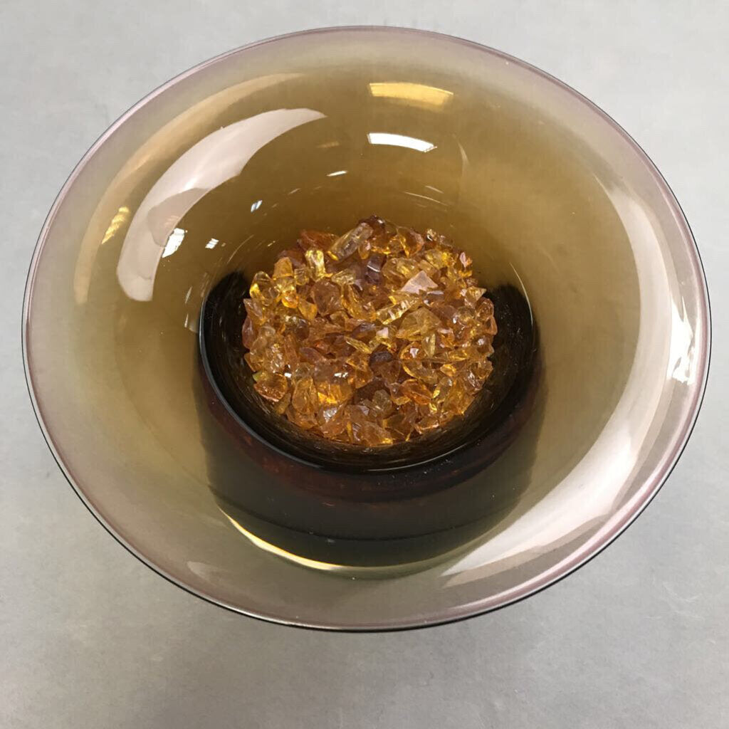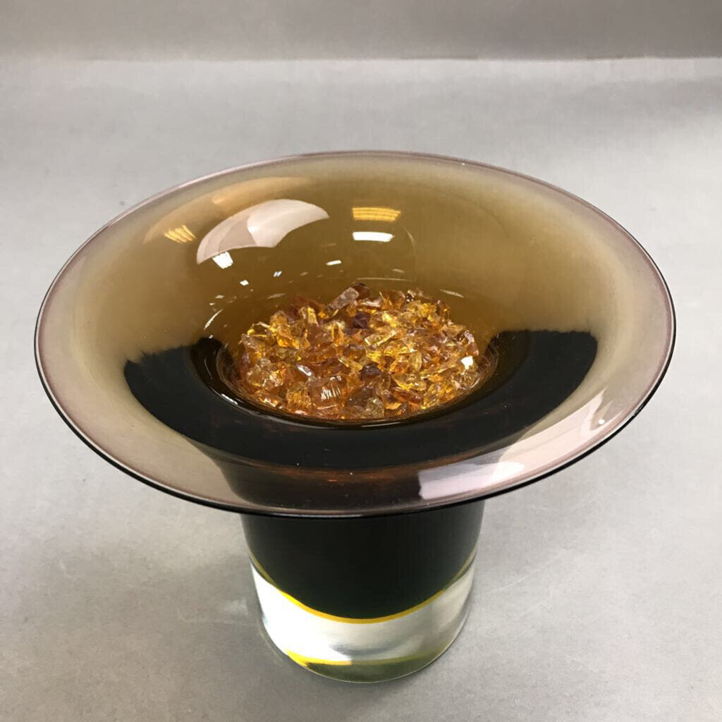 Vintage Amber Art Glass Bowl Vase with Amber Glass Flowers & Confetti (7x8)