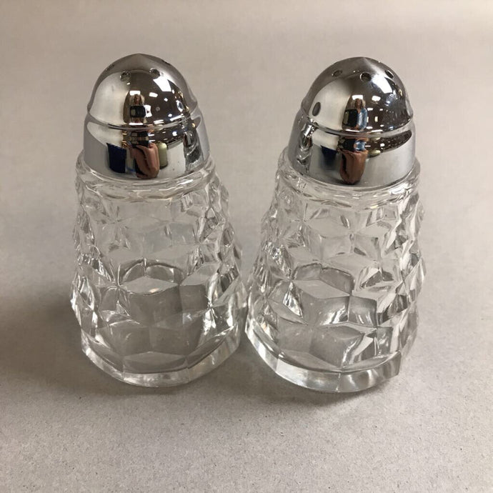 Vintage Fostoria American Tapered Salt & Pepper Shakers Clear Glass Chrome Cap