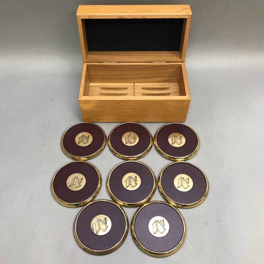 8pc "N" Brass/Leather Coaster Set In Wooden Box (5x5x9) "9pcs"