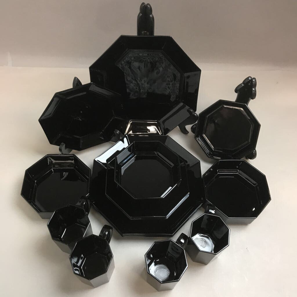 Arcoroc France Octime Black Glass 16 Piece Dish Set Mugs Plates Bowls