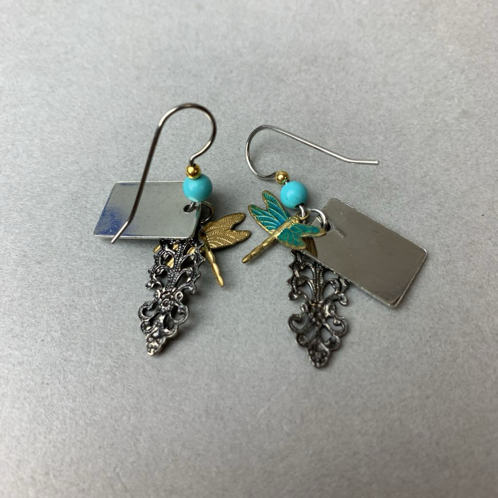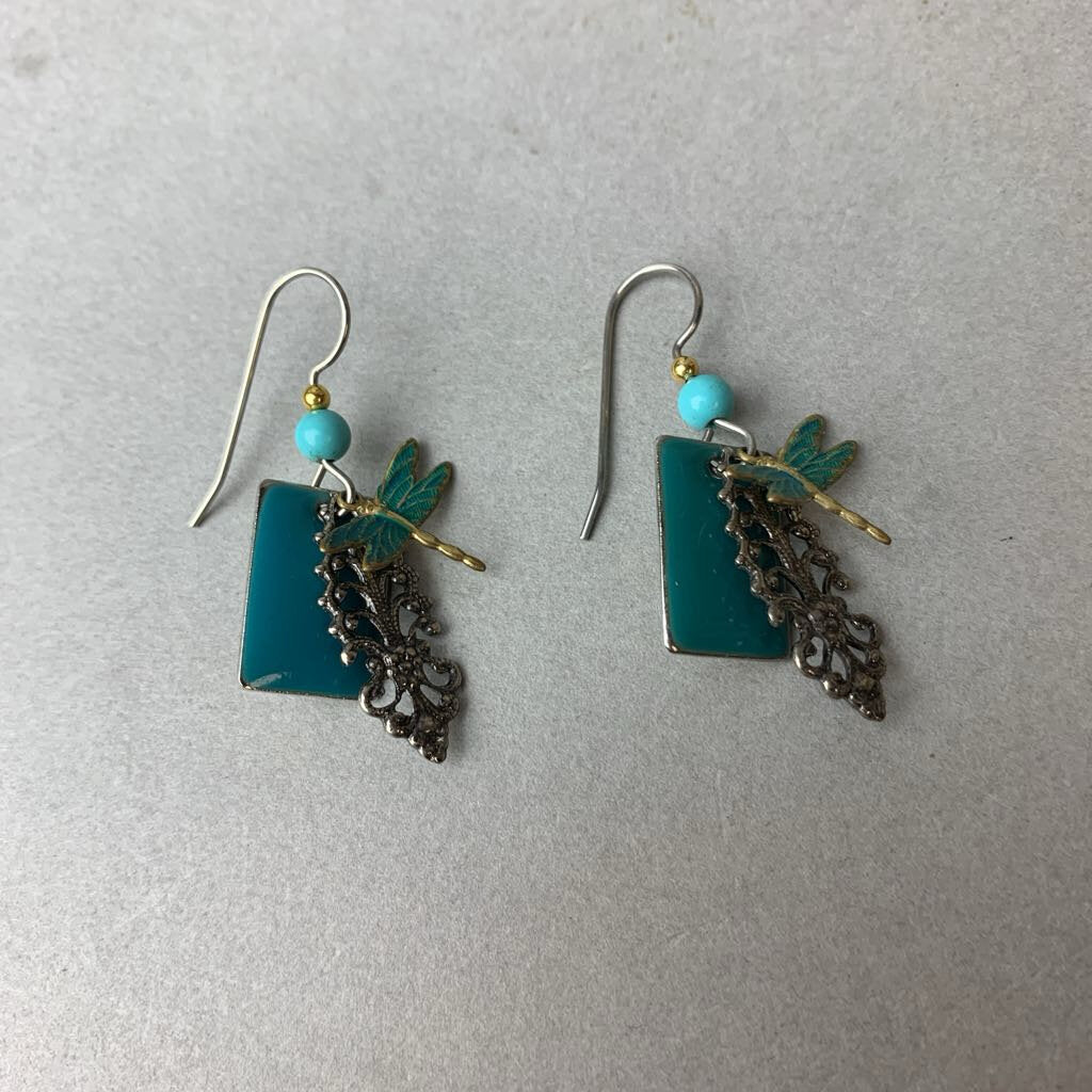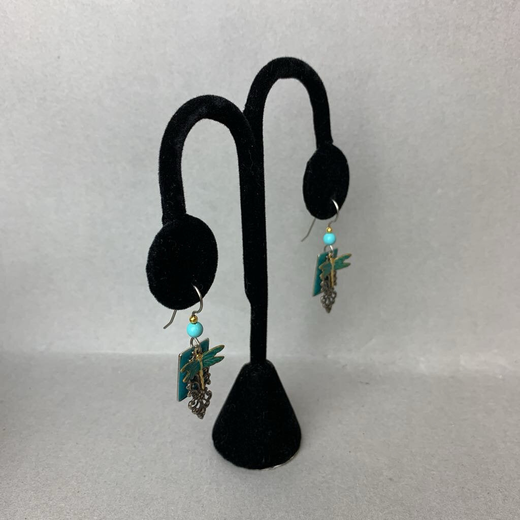 Silver Forest Dragonfly Turquoise Charm Earrings