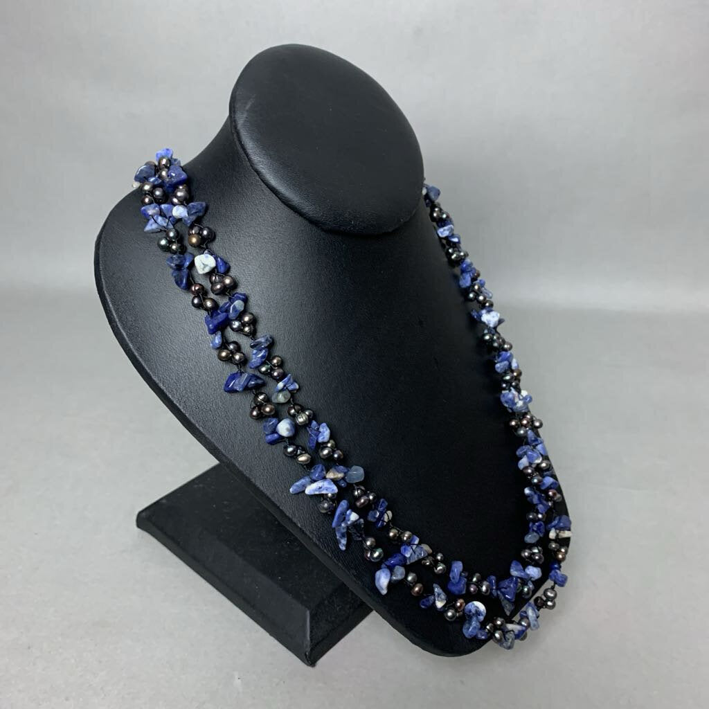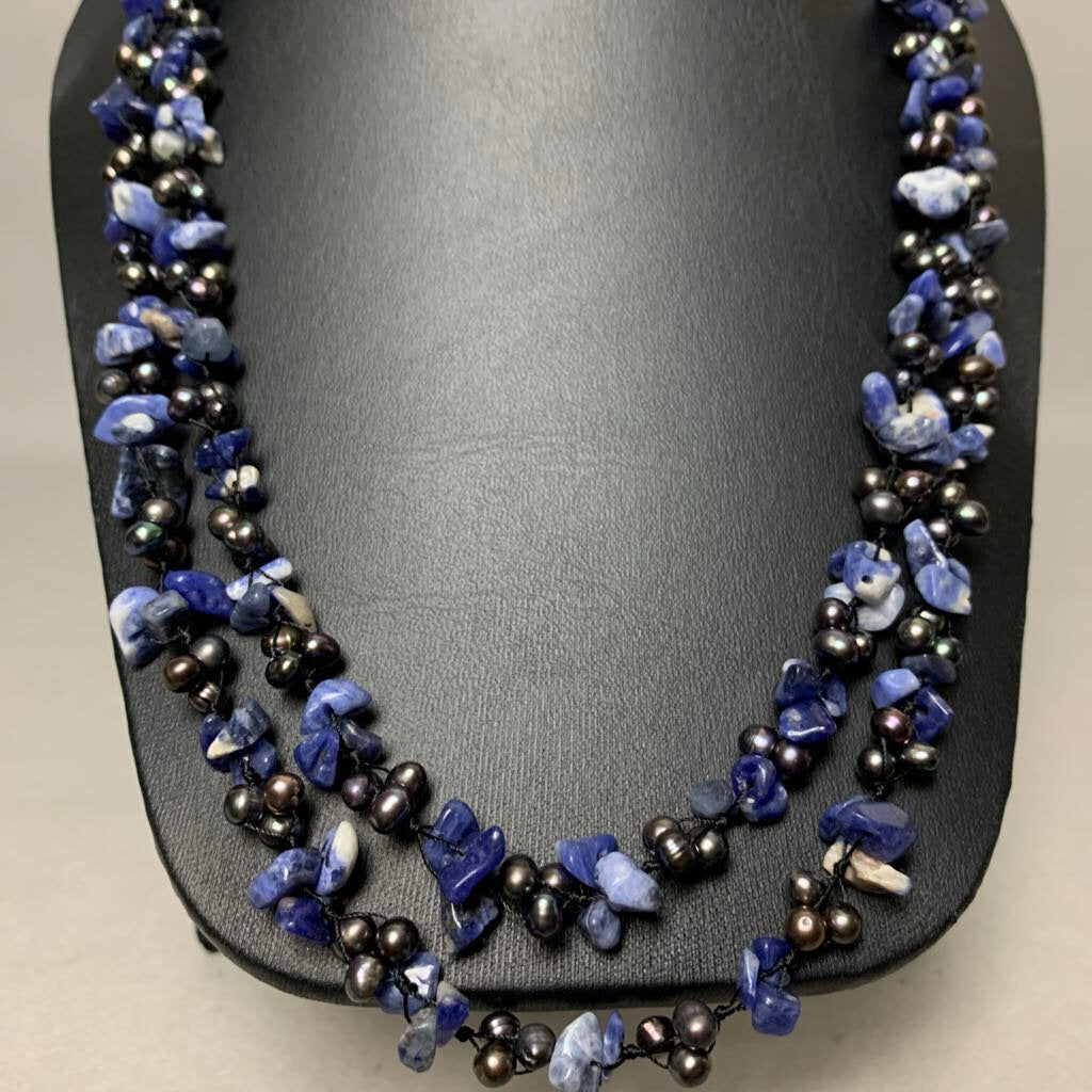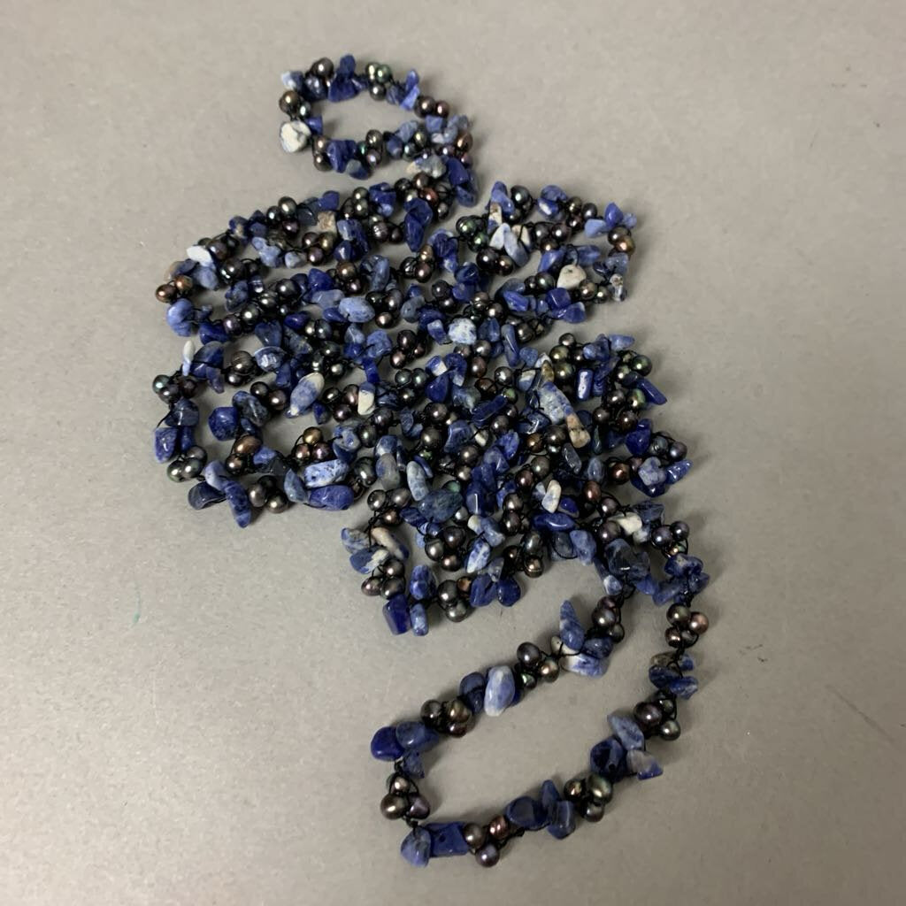 Sodalite Chip Bead Freshwater Pearl Knotted Long Necklace (58")