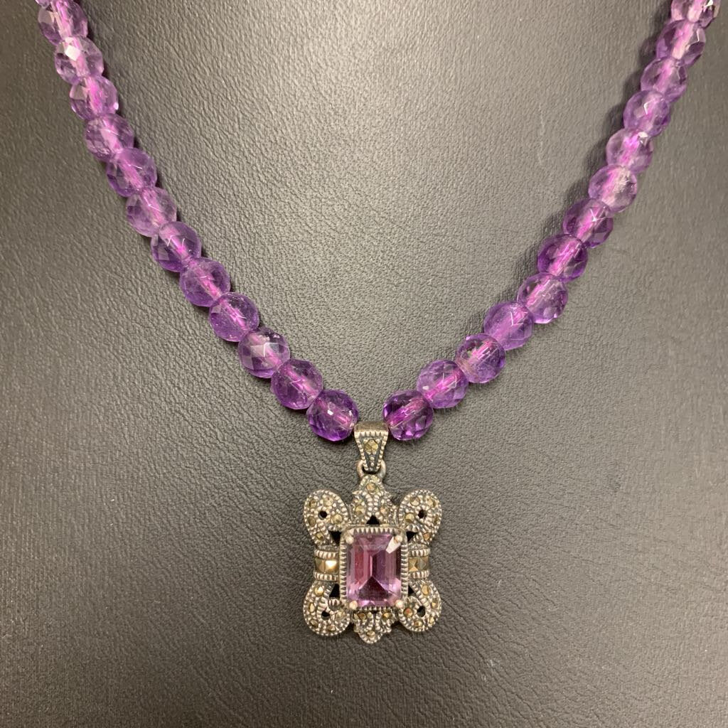 Sterling Amethyst Marcasite Pendant on Faceted Amethyst Beaded Necklace (16")