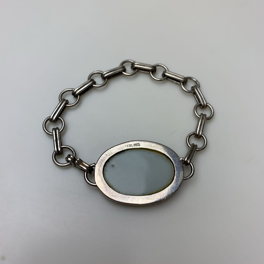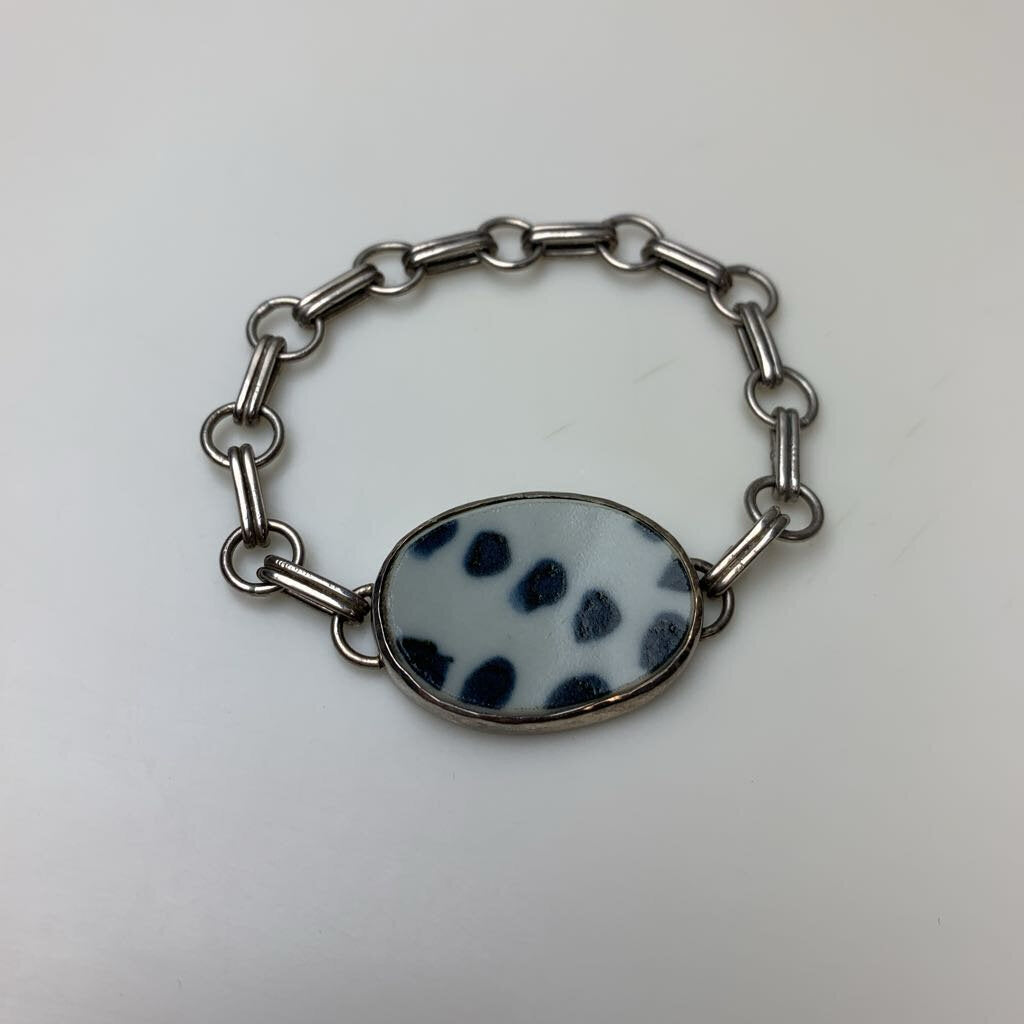 Vintage Artisan Recyled Ceramic Sterling Bezel Chain Bracelet Signed (7.5")