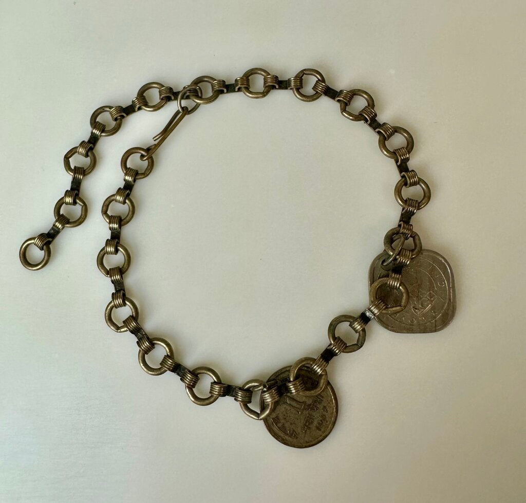 Vintage Brass Chain Bracelet Anklet w/ 1950 1957 Indian Coin Charms (11")