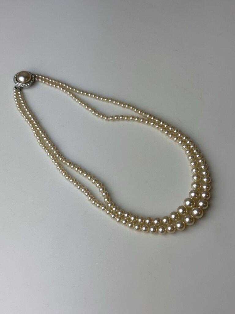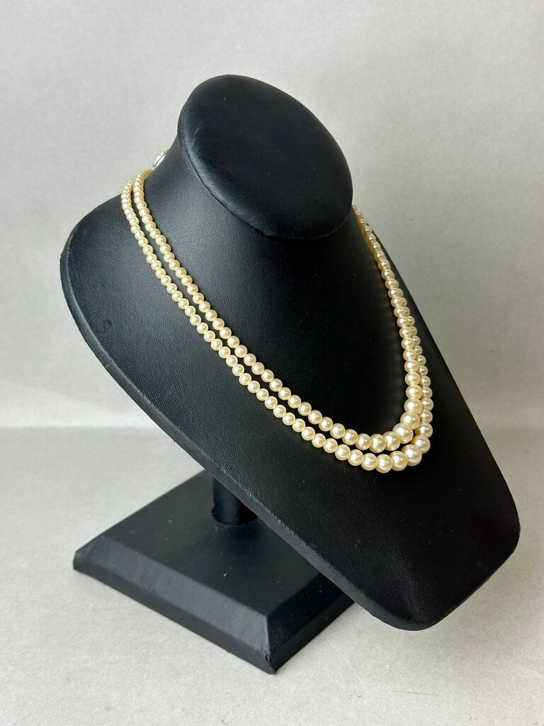 Vintage Cream Faux Pearl Two Strand Rhinestone Faux Pearl Clasp Necklace (16")
