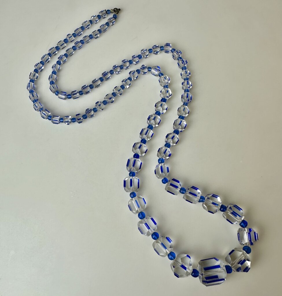 Vintage Czech Glass Clear Cobalt Pentagonal Graduated Bead Necklace (32")