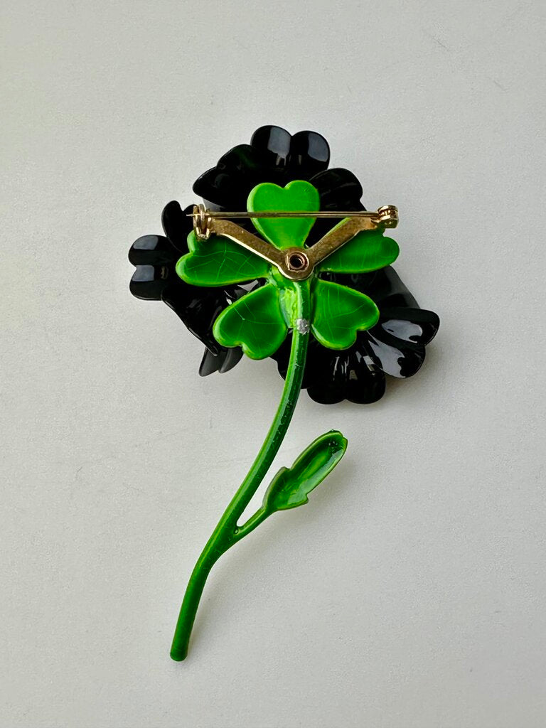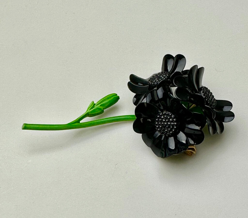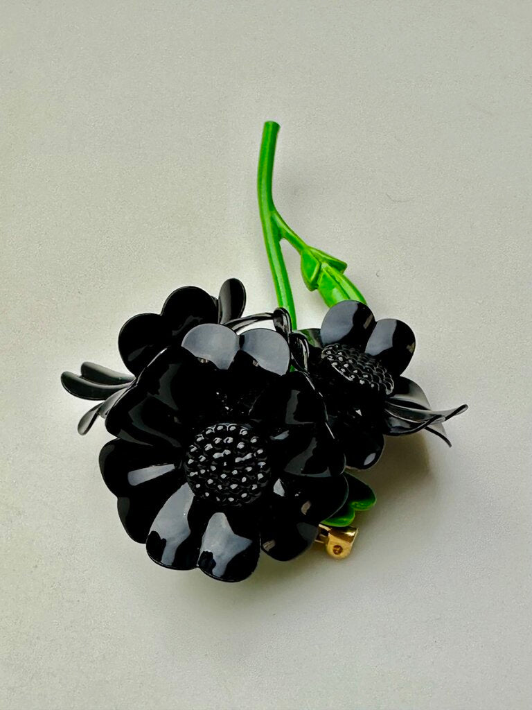 Vintage Enameled Metal Black Flower Brooch Pin (3.5"