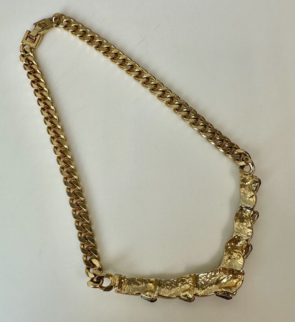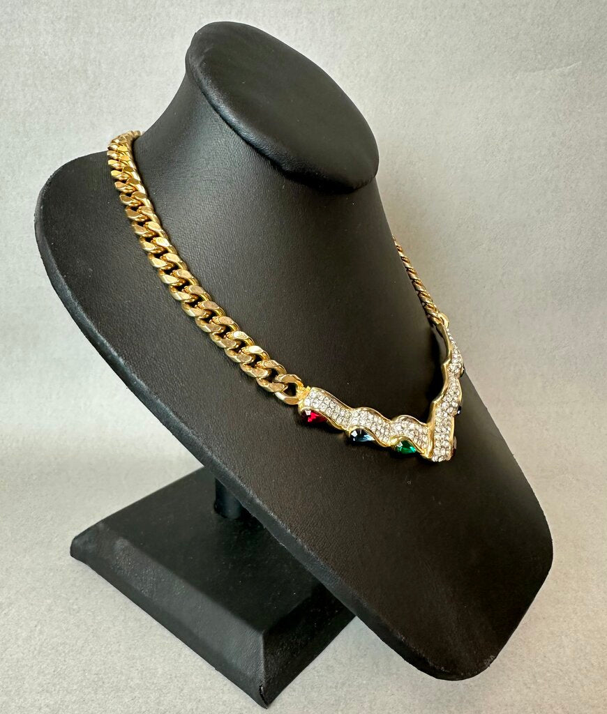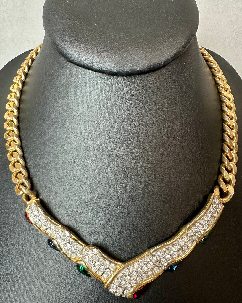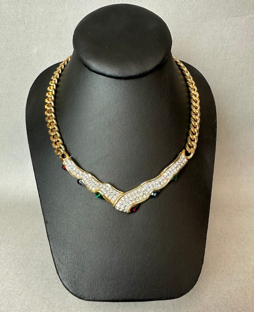 Vintage Goldtone Chunky Chain Clear & Jeweltone Rhinestone V Necklace (16")
