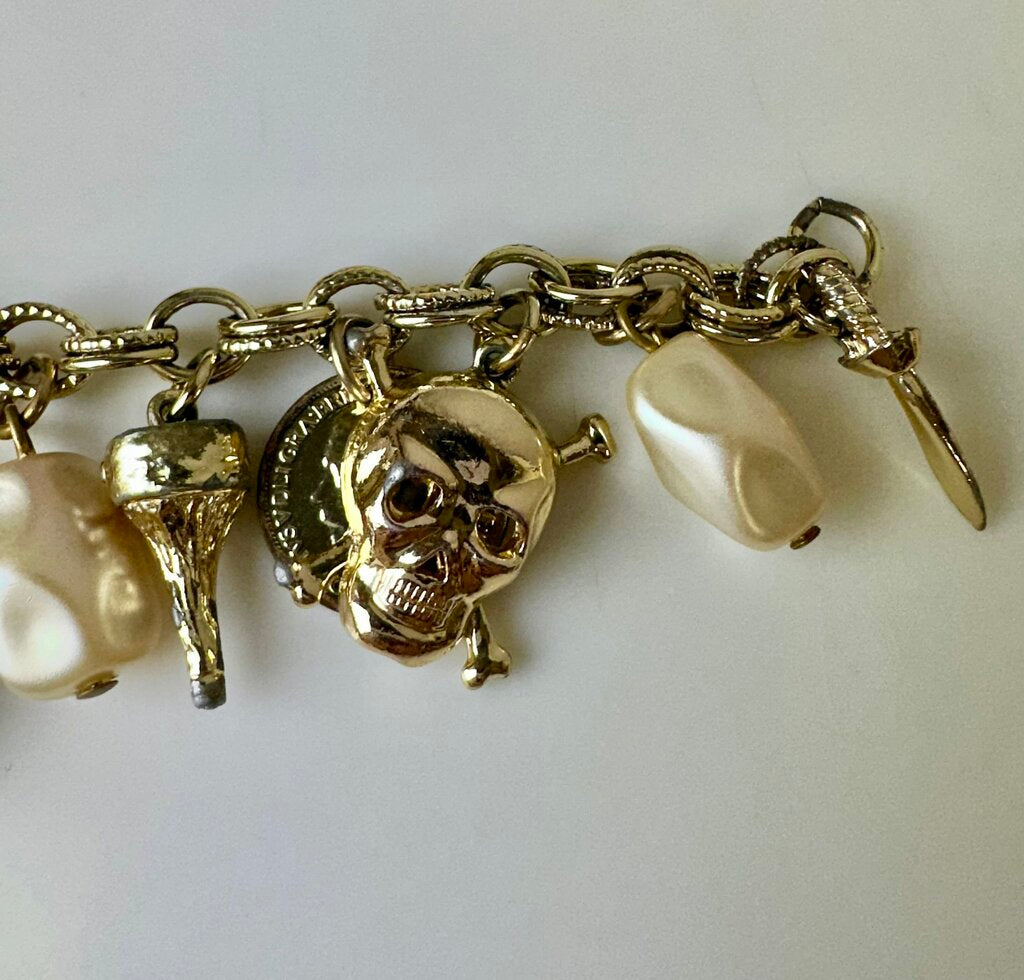 Vintage Goldtone Faux Pearl Pirate Theme Charm Bracelet (7.25")