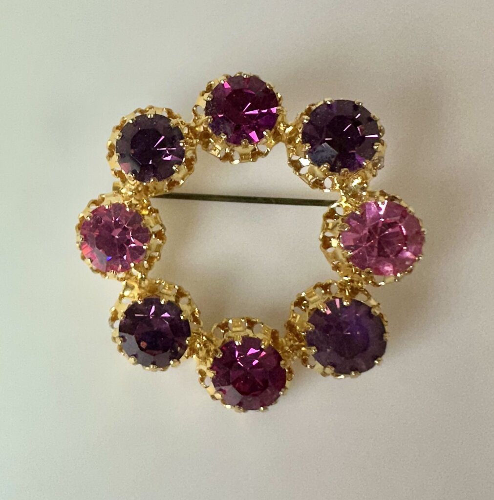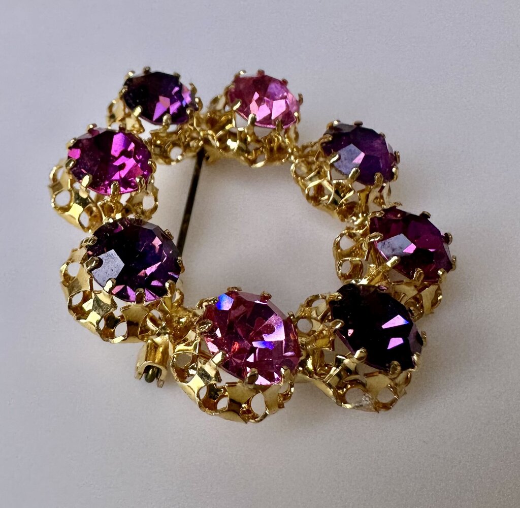 Vintage Goldtone Pink & Purple Austrian Crystal Circle Brooch Pin (1.5")