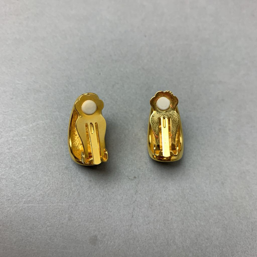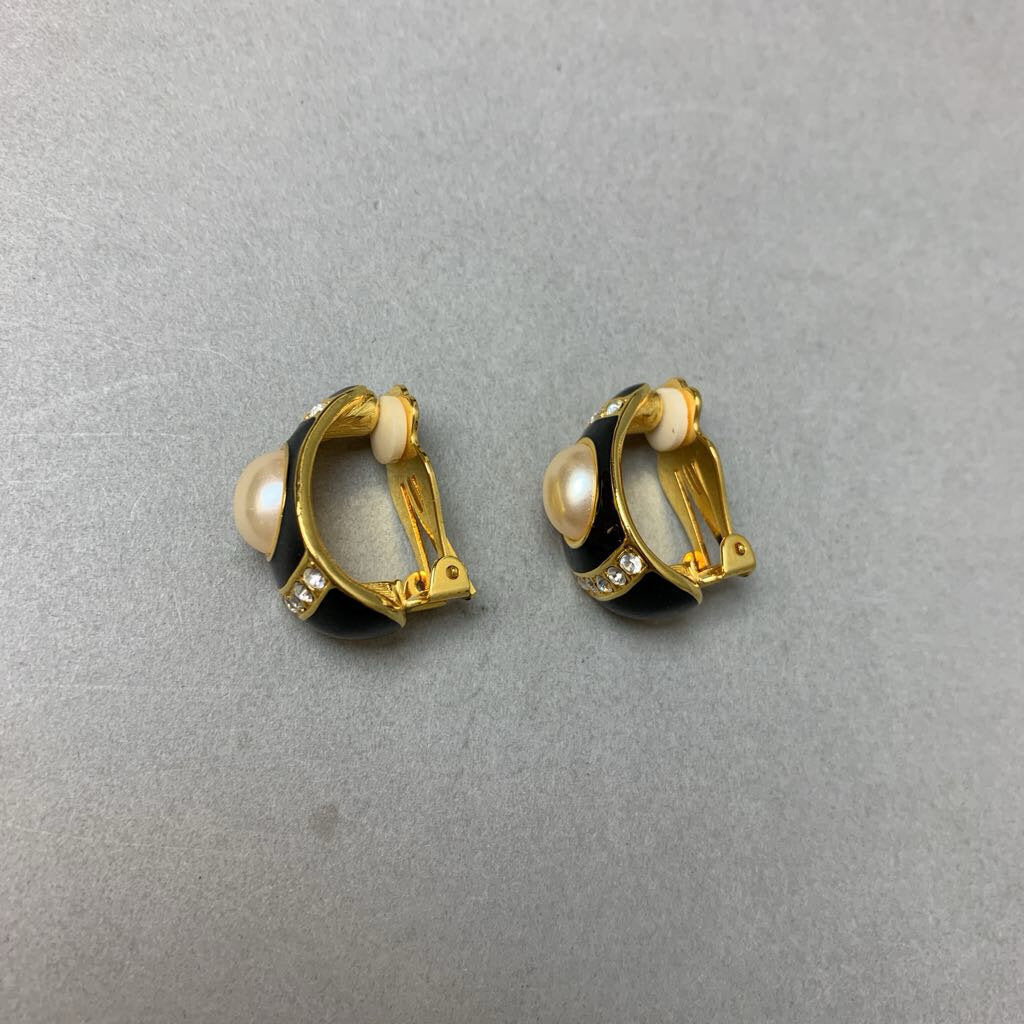 Vintage Joan Rivers Goldtone Faux Pearl Black Enamel Half Hoop Clip Earrings (1")