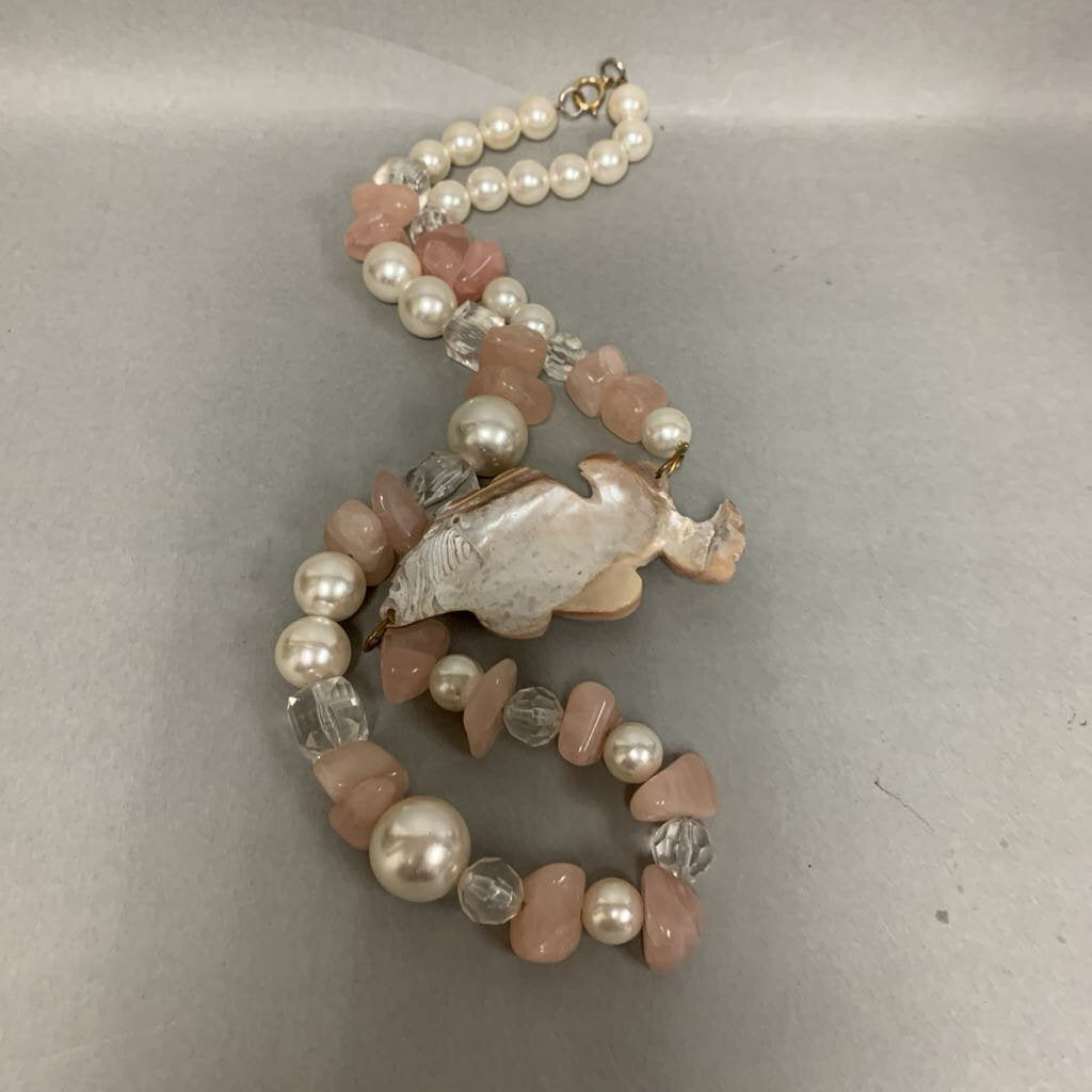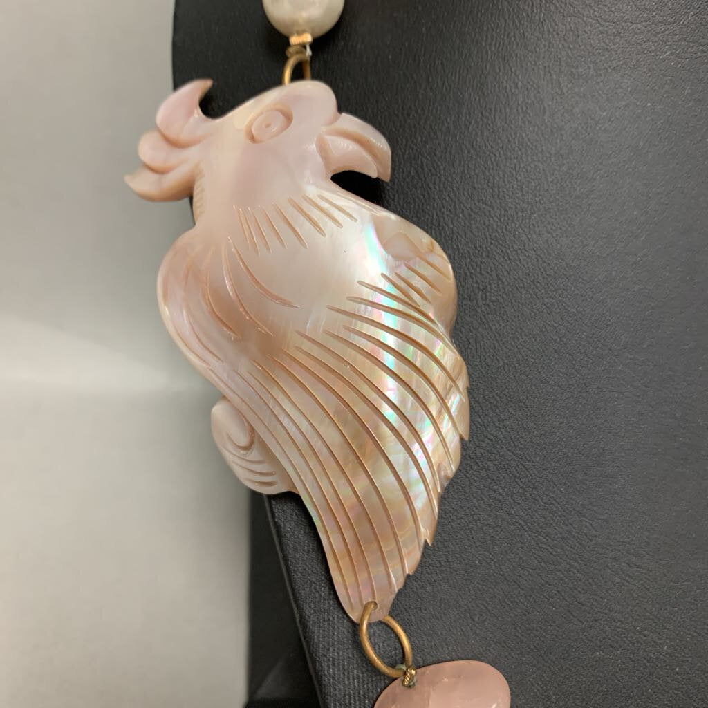 Vintage Large Carved Mother of Pearl Bird Faux Pearl Rose Quartz Beaded Necklace (32")