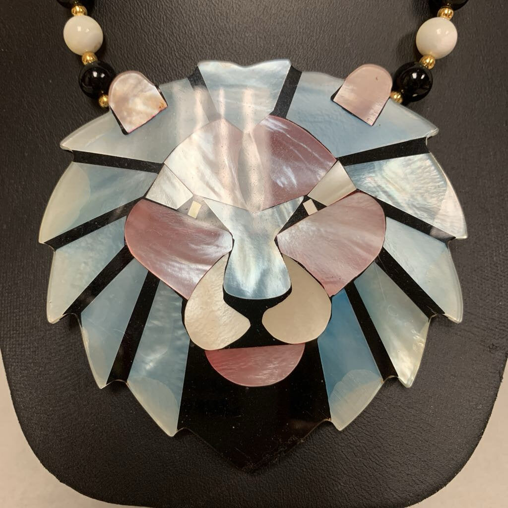 Vintage Lee Sands Mother of Pearl Onyx Inlay Lion Statement Necklace (22")