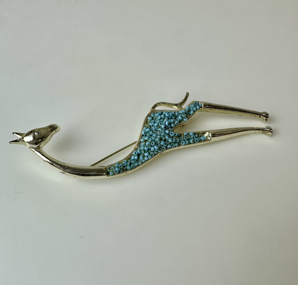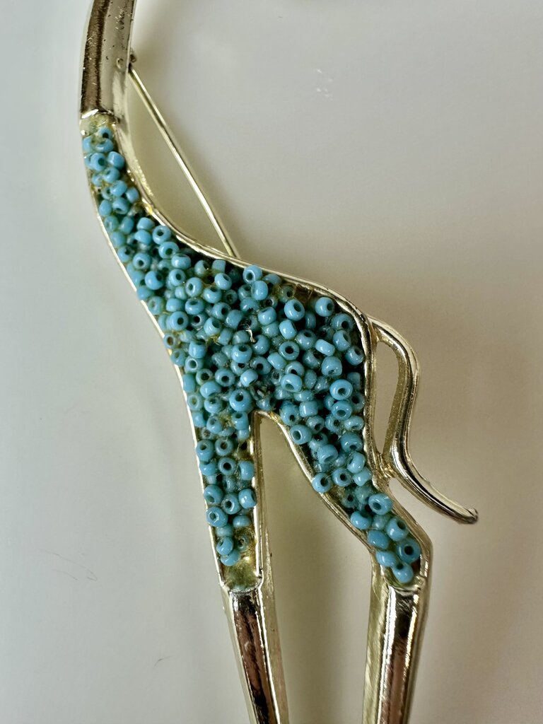 Vintage MCM Turquoise Seed Bead Goldtone Giraffe Brooch PIn (4.75")
