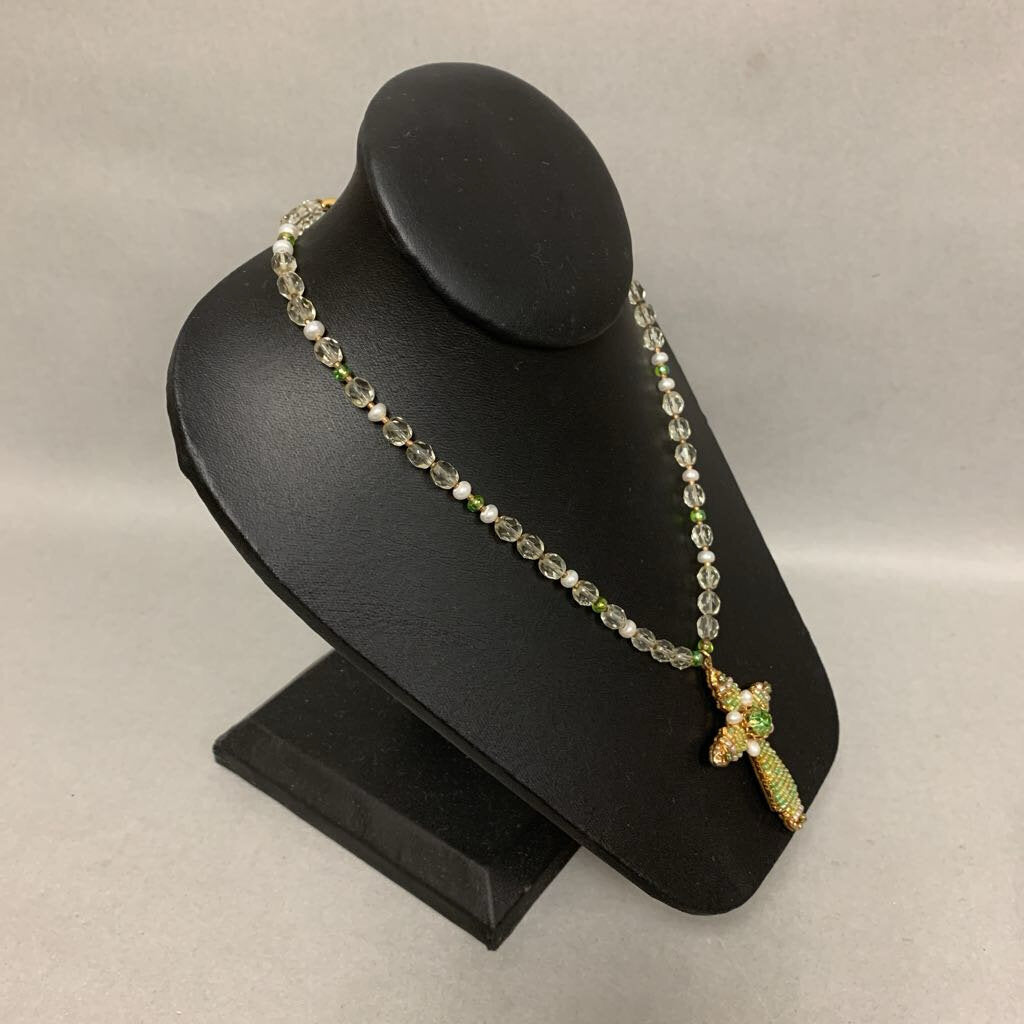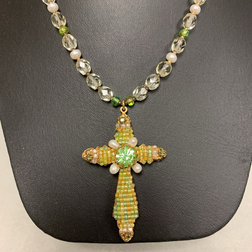 Vintage Miriam Haskell Green Clear Pearl Beaded Cross Necklace (20")