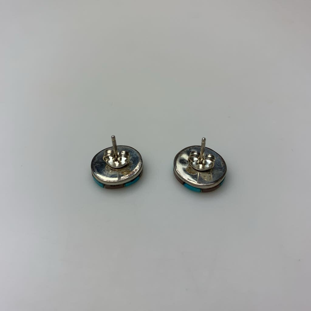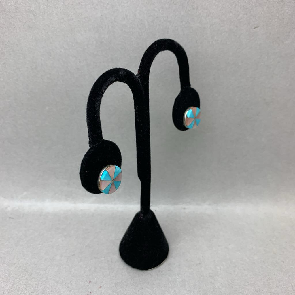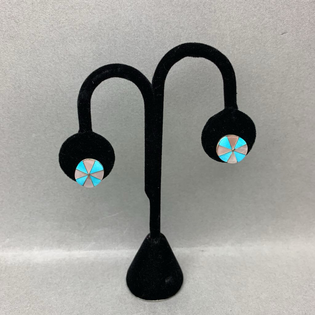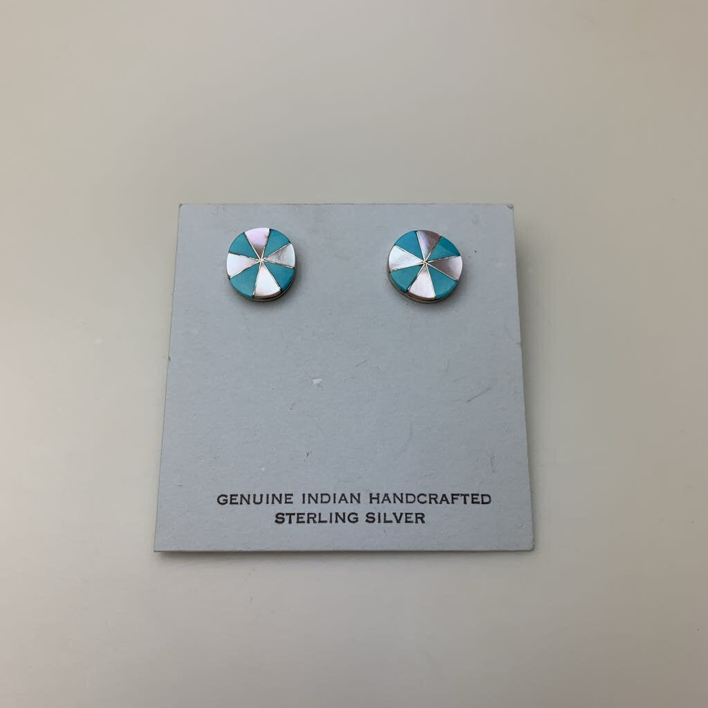 Vintage Native American Sterling Turquoise MOP Wheel Inlay 0.5" Stud Earrings