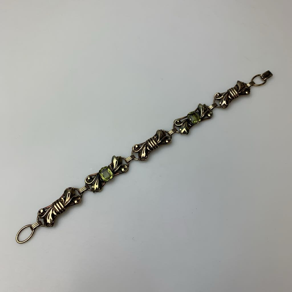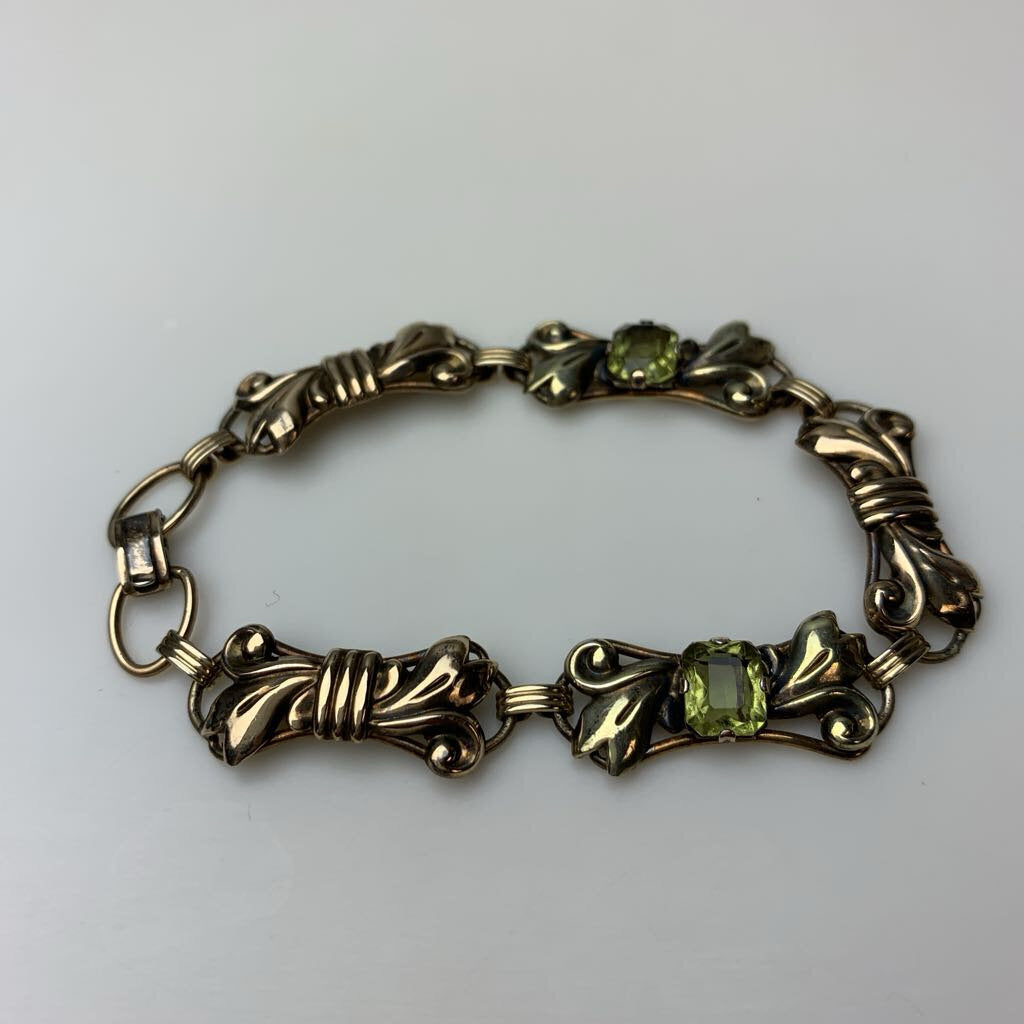 Vintage Providence Stock Company 12K Gold Filled Green Gem Bow Link Bracelet (7")