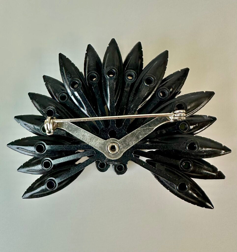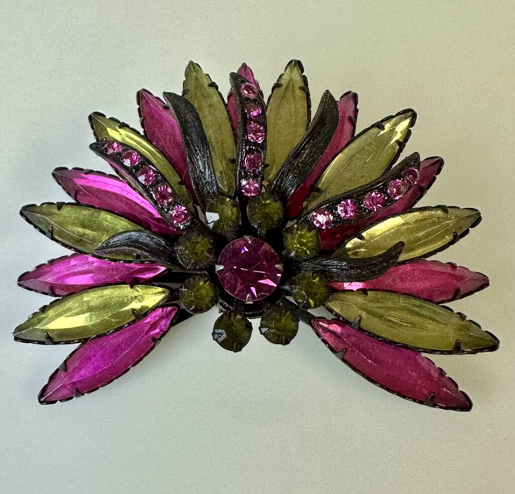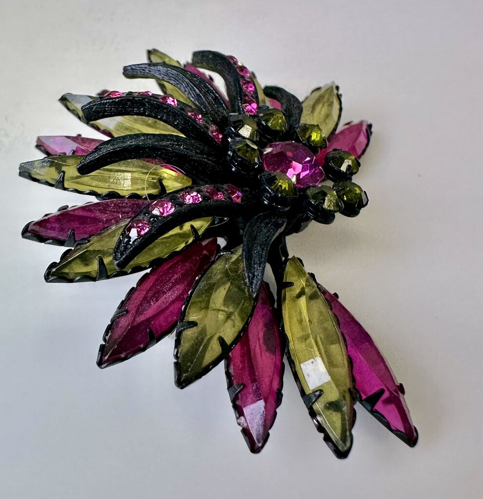 Vintage Selro & Selini Black Enamel Pink & Green Rhinestone Brooch Pin (3")