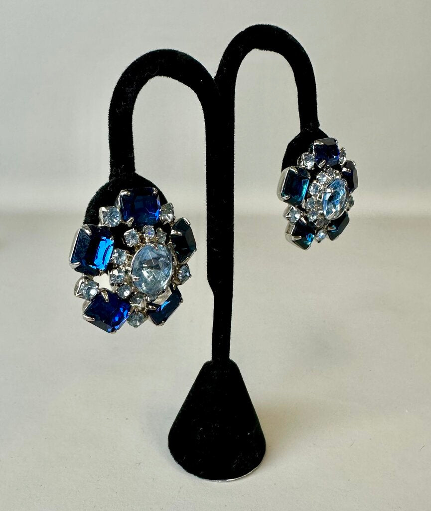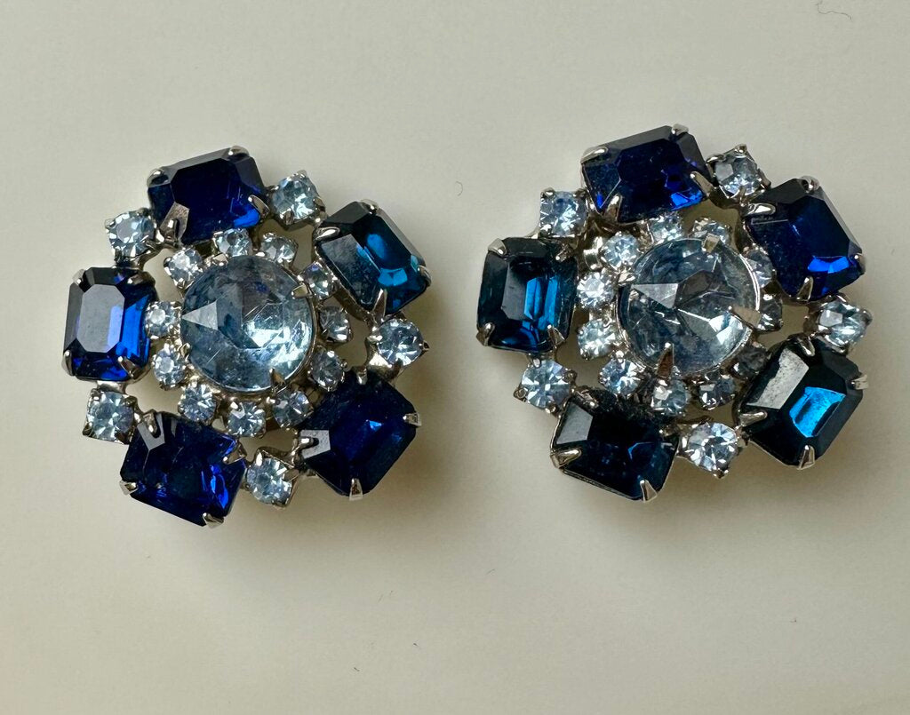 Vintage Shades of Blue Rhinestone Clip Earrings (1.25")