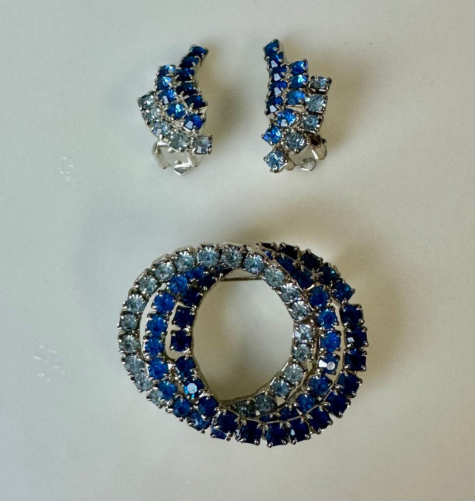 Vintage Shades of Blue Rhinestone Interlocking Circles 1.5" Brooch Pin w/ 1" Earrings Set
