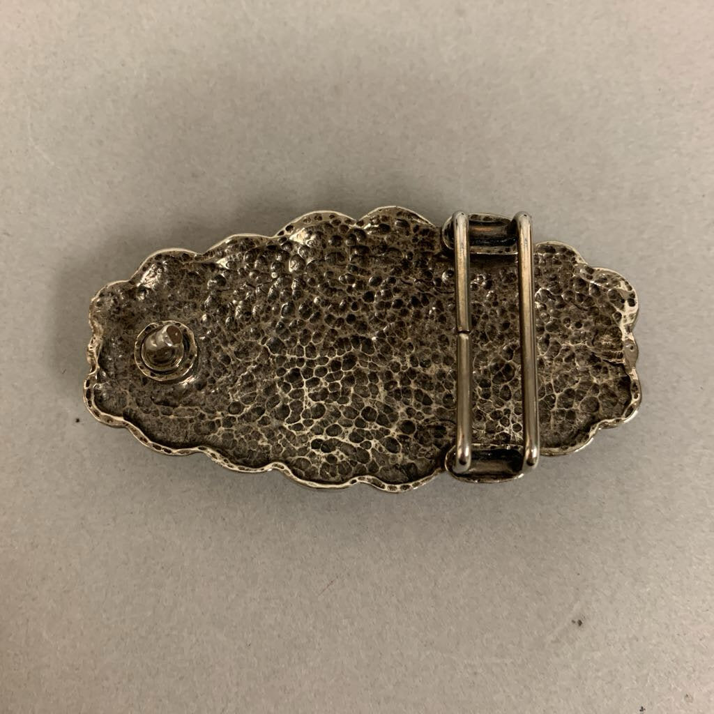 Vintage Silvertone Scroll Tigers Eye Green Agate Chip Inlay Belt Buckle (3.25")