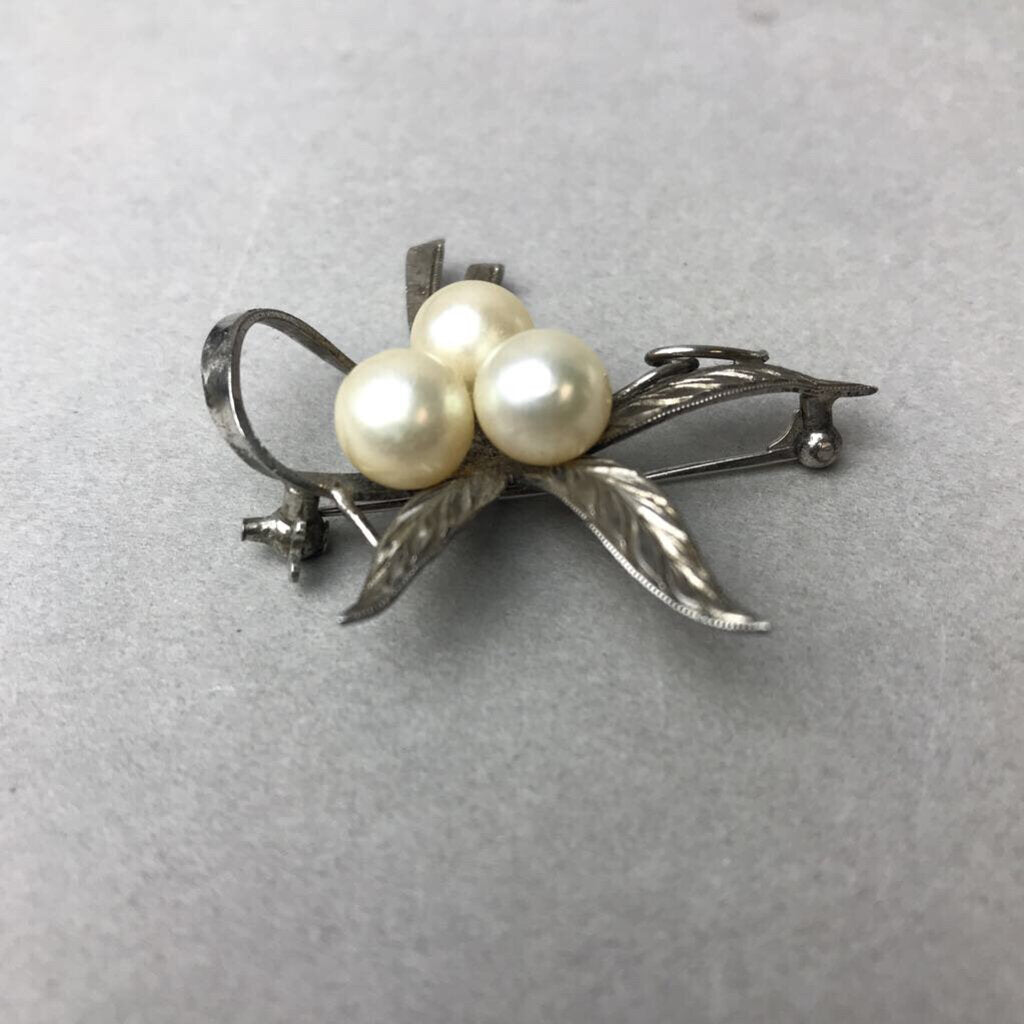 Vintage Sterling Cultured Pearl Ribbon Feather Brooch Pin (1.75")