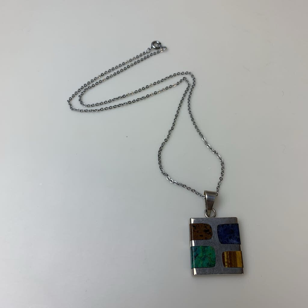 Vintage Sterling Tigers Eye Sodalite Jasper Inlay Pendant Made in Mexico on 17" Chain