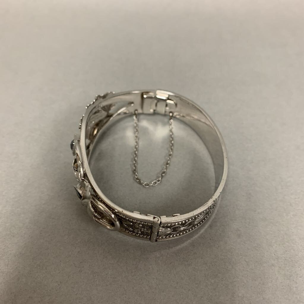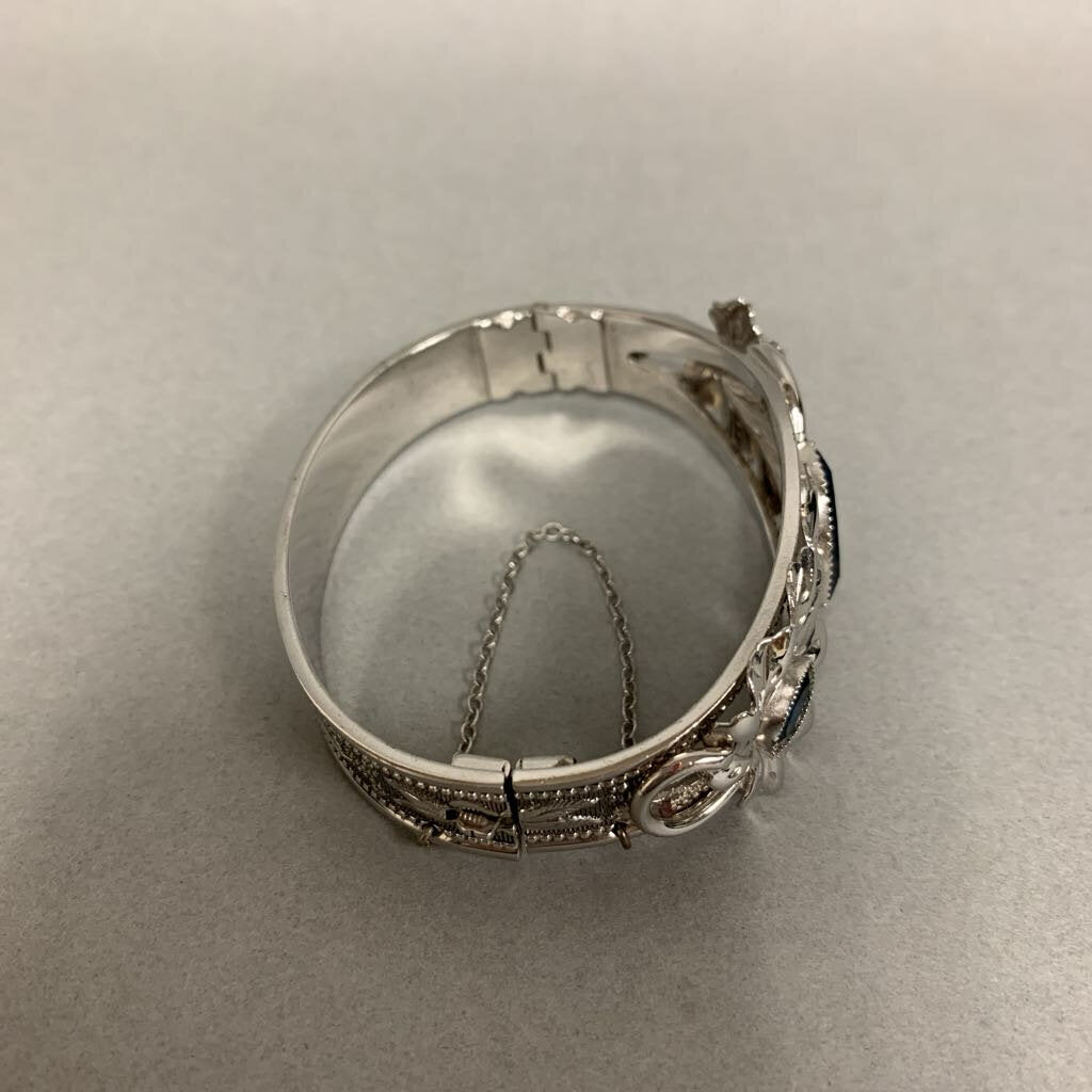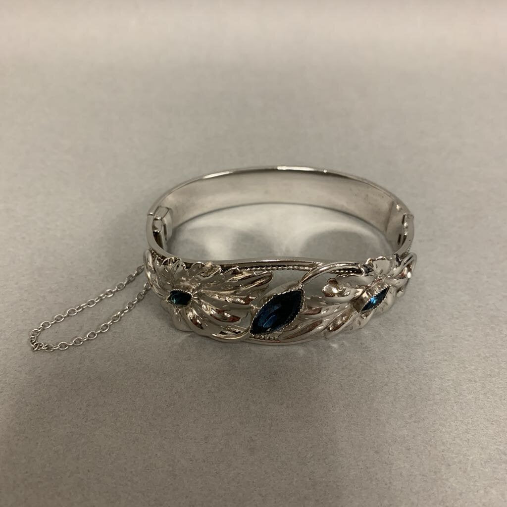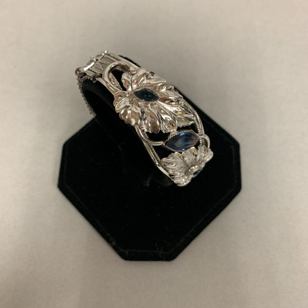 Vintage Whiting & Davis Silvertone Blue Marquis Crystal Leaves Hinged Cuff Bracelet (~7" Inside Circumference)