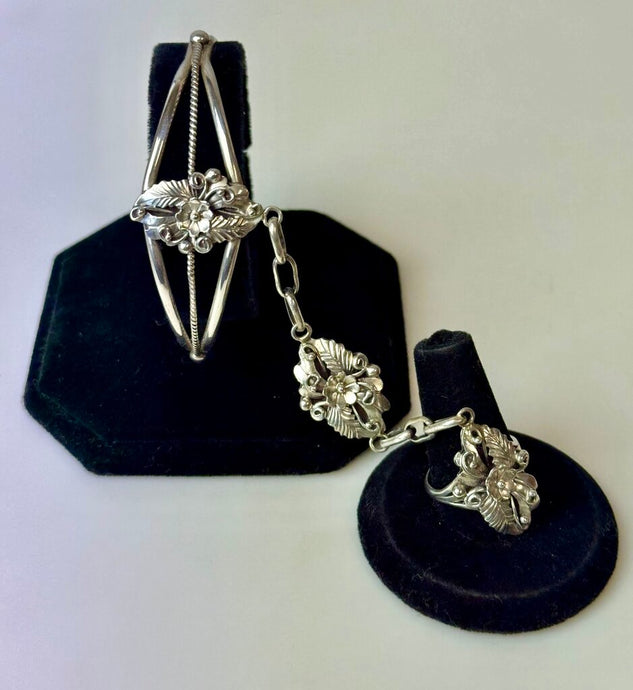 Vintage Navajo Sterling Floral Slave Bracelet Cuff w/ Attached Ring (Cuff is 2.5" Diameter, Ring is sz 8