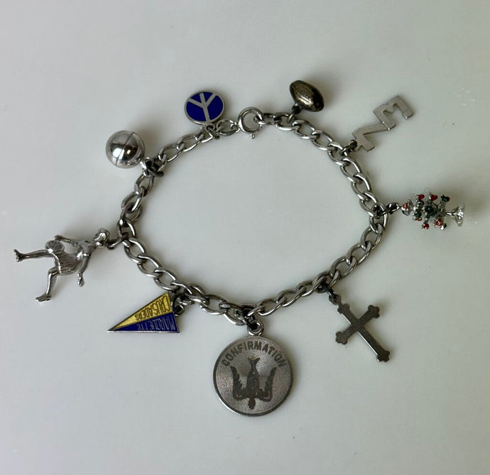 Vintage Sterling Charm Bracelet w/ Catholic Marquette School Sport & Holiday Charms (7")