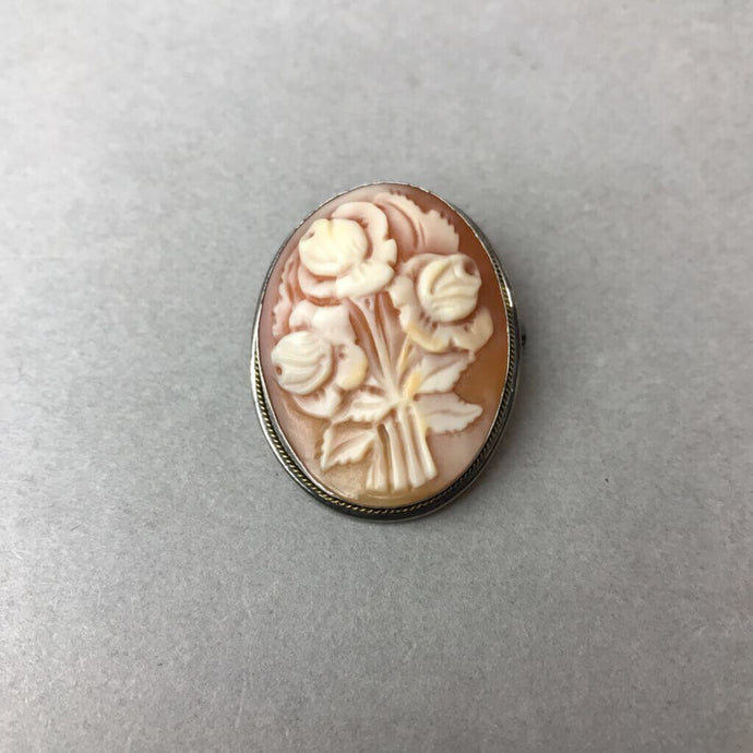 Vintage 800 Silver Carved Shell Roses Cameo Brooch Pin w/ Pendant Bail (1.25")![]()  - Regular price